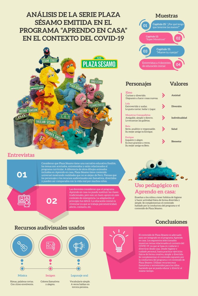 Resumen del trabajo: Esta investigación tuvo como objetivo analizar cómo funciona la propuesta de Plaza Sésamo emitida en el programa “Aprendo en Casa”. Plaza Sésamo se ha sumado a la propuesta del MINEDU para difundir por la televisión más de 60 materiales educativos con el fin de ayudar a los niños y niñas a establecer hábitos, saludables y promover el bienestar general. Para ello, se partió analizando el eje temático y el uso de recursos audiovisuales y se contrastó con testimonios de docentes de Educación Inicial en relación a su experiencia como educadores. Los resultados indican que existen grandes coincidencias sobre lo que el programa propone a los niños. Los docentes afirman la utilidad, el uso del lenguaje sencillo, claro y potente. A pesar de ser generaciones nuevas, los niños siguen logrando conectarse con los personajes míticos de Plaza Sésamo y comprender con éxito los objetivos de los episodios, los cuales, bajo la mirada educadora delos docentes y los análisis realizados, contienen temas oportunos para el contexto que estamos viviendo.
