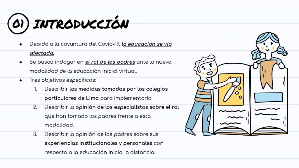 Resumen del trabajo: Al encontrar la educación peruana en un estado de crisis debido a la coyuntura mundial presente por el covid-19, se consideró importante indagar sobre las nuevas formas de educación inicial que se están llevando a cabo hoy en día en el país, a raíz de las limitaciones por la crisis mundial. De esta manera, la educación presencial pasó a ser virtual y así el rol de los padres se modificó, tomando una mayor presencia en la enseñanza de sus hijos. Con lo cual, decidimos explorar en la percepción de los padres y madres de los estudiantes de inicial, entre la edad de 3 a 5 años, de colegios particulares de Lima, sobre su rol en el contexto de la educación a distancia. En ese sentido, los objetivos específicos son tres: en primer lugar, describir las medidas tomadas por los colegios particulares de Lima para implementar una educación a distancia en el nivel inicial; en segundo lugar, describir la opinión de los especialistas sobre el rol que han tomado los padres con respecto a este nuevo sistema educativo; y, por último, describir la opinión de padres y madres sobre su experiencia institucional y personal frente a la educación inicial a distancia.