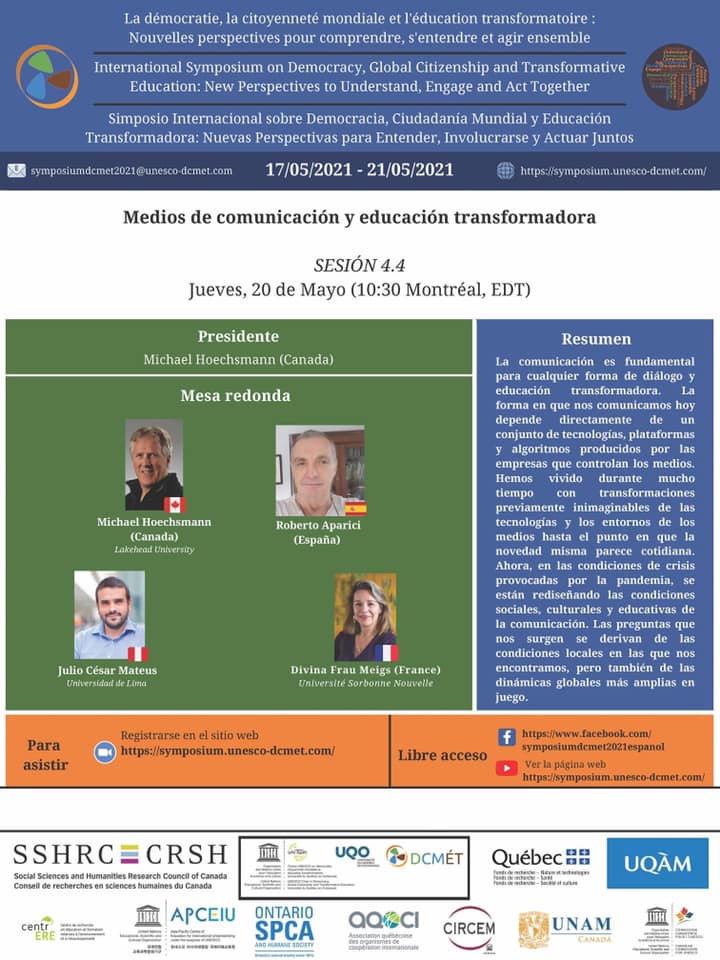 A propósito, el próximo jueves 20 de mayo, conversaré con los especialistas Roberto Aparici, Divina Frau Meigs y Michael Hoechsmann sobre este tema en el panel “Medios de comunicación y educación transformadora”, organizado por la Cátedra UNESCO en Democracia, Ciudadanía Mundial y Educación Transformadora de la Universidad de Québec (Canada). La sesión será en castellano y la inscripción gratuita y abierta al público en el siguiente enlace: https://symposium.unesco-dcmet.com/es/