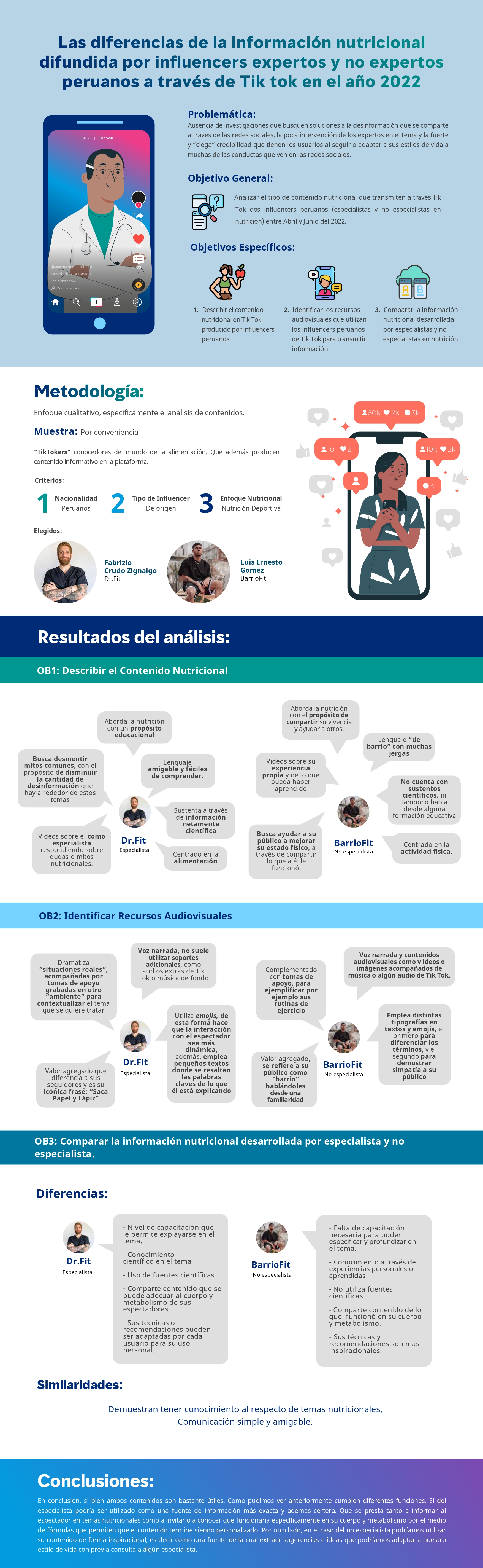 Resumen: Con el transcurso del tiempo, las redes sociales han ido generando más impacto en la población mundial, en especial, Tik Tok. Esta última es la aplicación del momento y la cual viene ocupando más espacio en el día a día de los usuarios de redes sociales. En relación a esto, sabemos que dentro de estos canales hay espacio para creadores de contenido, tanto expertos como no expertos en distintos ámbitos. Es por ello que el presente trabajo de investigación analiza el tipo de contenido nutricional que brindan dos influencers peruanos (especialista y no especialista) a través de la plataforma, Tik Tok. En este estudio se empleó una metodología con enfoque cualitativo usando la técnica de análisis de contenido en cinco videos de cada tik toker, estos son Luis Gomez (Barrio_Fit) y Fabrizio Crudo (Dr.fit.pe). Se concluye que ambos contenidos son bastante dinámicos y útiles. El del especialista podría ser utilizado como una fuente de información más verídica que transmite sus conocimientos científicos y aclara los mitos nutricionales. Por otro lado, en el caso del no especialista se podría emplear su contenido de forma inspiracional; es decir, como una fuente de la cual serviría para extraer sugerencias e ideas, y de esta manera adaptarlo a nuestro estilo de vida con previa consulta a algún especialista.