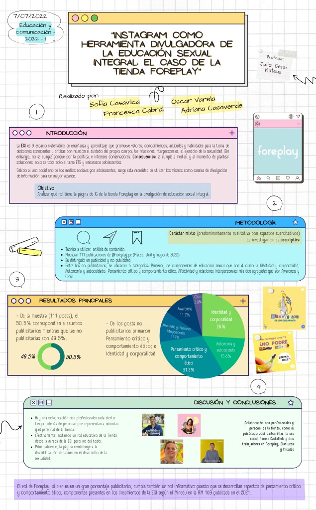 Resumen: La presente investigación tuvo como objetivo analizar el rol que tiene la tienda Foreplay en la divulgación de la Educación Sexual Integral. Para ello, se realizó un análisis de contenido a su página de Instagram entre los meses de marzo, abril y mayo del presente año. Se utilizó la Resolución Viceministerial promulgada en 2021 por el MINEDU para la categorización de dichas publicaciones. Los resultados arrojaron que la identidad y corporalidad, así como el pensamiento crítico y comportamiento ético fueron las categorías a resaltar. El rol de la tienda Foreplay fue calificado como rol de educador sexual, pero no en su totalidad.