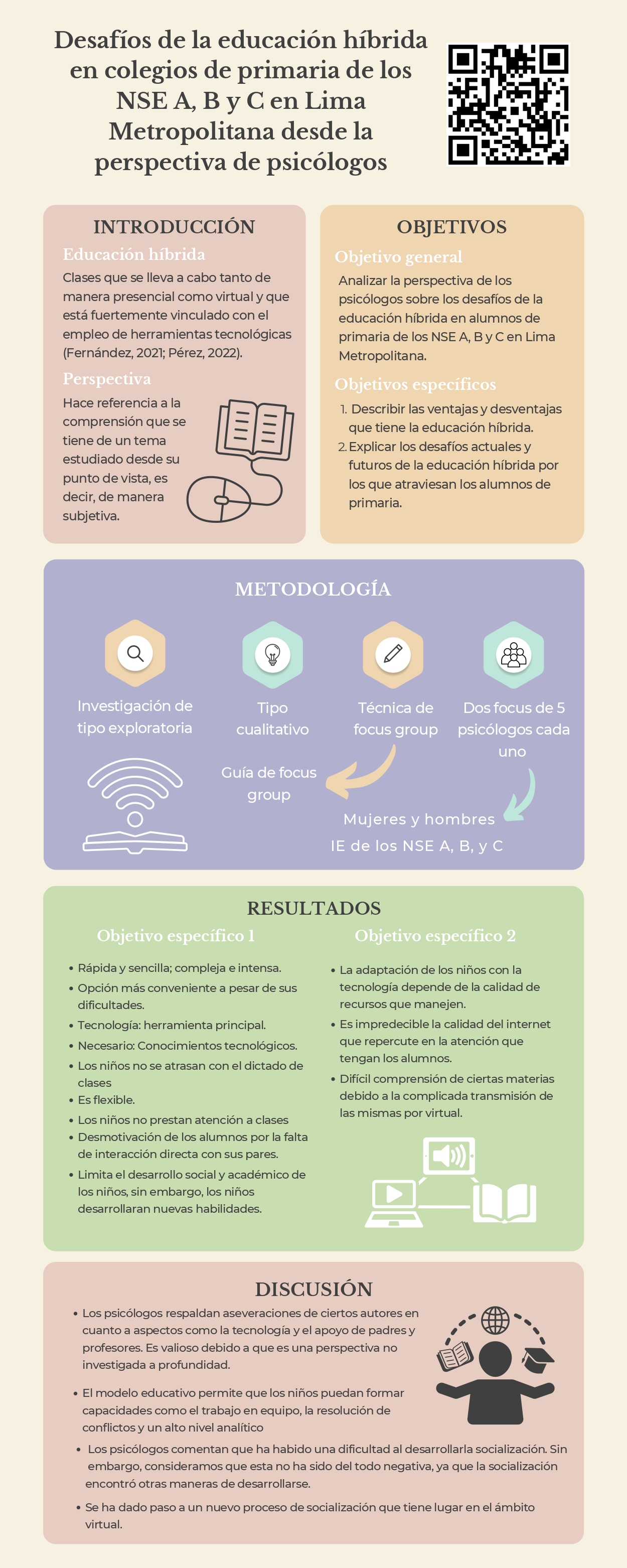 Resumen. Es indiscutible que la llegada del COVID-19 al Perú ha tenido un impacto en el ámbito educativo. A partir de ese contexto, la educación híbrida cobró gran relevancia en múltiples colegios de Lima Metropolitana. Por esta razón, el presente estudio pretende analizar, desde la perspectiva de psicólogos educativos, los desafíos de la educación híbrida en alumnos de primaria. Para ello se llevaron a cabo dos focus groups, en los que participaron una muestra total de diez psicólogos, entre los 35 y 45 años, que trabajan en colegios pertenecientes a los niveles socioeconómicos A, B y C. El resultado que más destacó muestra que, a pesar de las diferentes adversidades que trae consigo la educación híbrida, de entre las cuales resalta la dificultad del proceso de socialización, los niños han sido capaces de desarrollar nuevas competencias y habilidades. Por lo tanto, se recomienda seguir apostando por este modelo educativo.