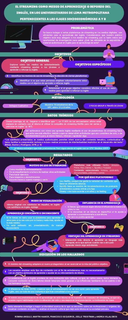 Resumen: La presente investigación tiene por objetivo analizar si los medios de streaming efectivamente sirven como un medio de aprendizaje o refuerzo del idioma inglés para estudiantes de Lima Metropolitana pertenecientes al sector económico A/B. Esto se debe a que el inglés, al ser la lengua extranjera más aprendida en nuestro país, es un factor clave en la manera en la que el público objetivo se desenvuelve, en especial al estar en contacto con las diversas plataformas de streaming que han dominado el mercado del entretenimiento. La metodología tiene un enfoque cualitativo y se realizó un focus group como instrumento con una muestra de 10 estudiantes. Como resultado, se obtuvo que, si bien se considera que se puede realizar un aprendizaje principalmente sobre formas de hablar y diferentes acentos, hubo realmente una influencia tanto cultural como familiar al momento de preferir consumir contenido en inglés.