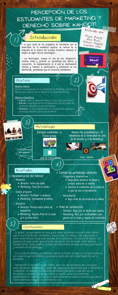 Resumen: Kahoot! es una plataforma online de aprendizaje basada en juegos usada en todo el mundo por profesores, estudiantes y empresas. Esta plataforma permite crear juegos y pruebas divertidas en minutos, en cualquier momento y lugar” (Mingo López, y Meliá, 2019, p.6). El objetivo de este trabajo es describir las percepciones de los estudiantes de séptimo ciclo sobre el uso de Kahoot en la Universidad de Lima. La metodología fue cualitativa, a partir de la aplicación de dos focus group, uno a universitarios de la carrera de marketing y otro, a universitarios de la carrera de derecho. Los resultados describen que, al usar la herramienta, los estudiantes se motivan a participar en clases y se involucran más con esta. Sin embargo, puede generar emociones negativas cuando Kahoot tiene un efecto sobre la calificación de ellos.