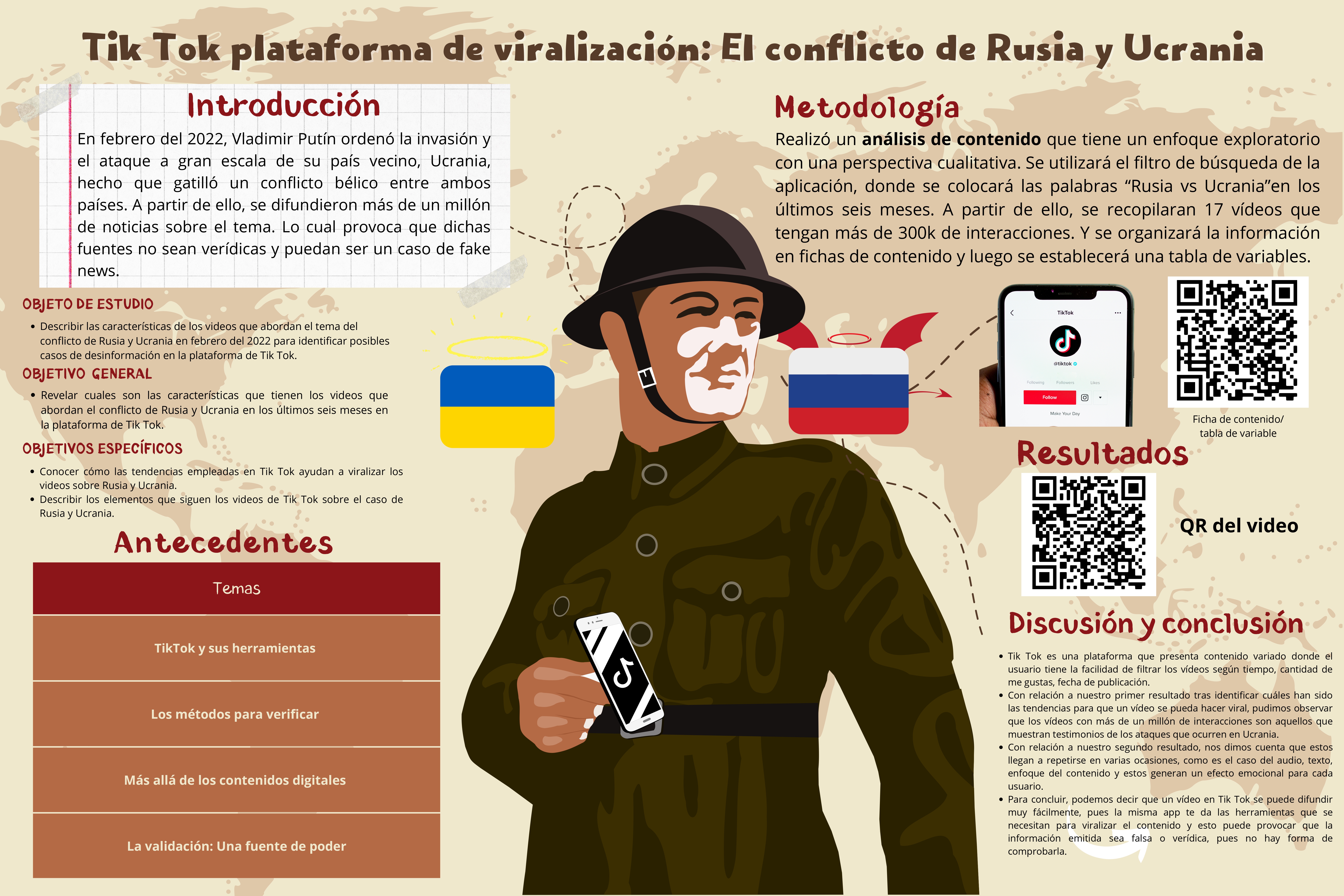 Resumen: A inicios del 2022, tras el surgimiento del conflicto entre los países: Rusia y Ucrania, el evento se ha convertido en el foco de atención principal para millones de usuarios de Tik Tok. Ante este contexto, el estudio está enfocado en revelar las características de los vídeos de Tik Tok que abordan el conflicto entre ambos países. Para ello, se realizó un análisis de contenido con enfoque exploratorio, seguido de una tabla de variables aplicado a 17 vídeos publicados durante los últimos seis meses que fueron filtrados a través del buscador con las palabras clave «Rusia vs Ucrania». Los resultados evidencian el predominio de (a) fuentes de carácter testimonial y aquellos que presentan fragmentos de noticias; y (b) el uso de hashtags y audios en tendencia dentro de los contenidos como método para impulsar la difusión de los vídeos. Además, se expone la preponderancia por (c) utilizar los textos como medio para potenciar el mensaje del conflicto Rusia-Ucrania en sus espectadores; y (d) apelar a emociones negativas, especialmente la tristeza y el miedo, como estímulo para facilitar la viralización del contenido. En conclusión, los elementos composición de los contenidos de Tik Tok cumplen un factor importante para potenciar el mensaje y generar un impacto en sus espectadores.