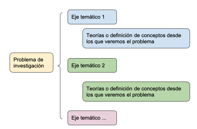 Como dice Liuba Kogan (2009), el marco teórico puede hacerse organizando la información proveniente de una o de varias perspectivas teóricas, los conceptos clave y los datos relevantes que nos permitirán adentrarnos en el estudio. No es un compendio de definiciones enciclopédicas dispuestas por ahí al azar: es una estructura ordenada, lógica y convincente según queremos que nuestro trabajo sea comprendido. Por eso conviene pensar desde el inicio siguiendo un mapa conceptual más o menos así: