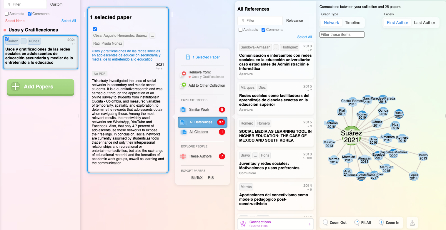 Una vez que hallamos las primeras fuentes interesantes y pertinentes, podemos echar mano de aplicaciones especializadas, como ResearchRabbit, que permiten ir rastreando en línea manuscritos y autores. A través de un formato muy visual, uno puede ir enriqueciendo sus colecciones temáticas, como vemos en la siguiente Figura: