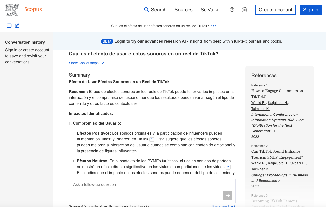La que trabajamos en nuestro curso (y por lo tanto, es la que recomiendo) es la IA de Scopus. Basta con plantear una pregunta para que Scopus busque en su base de datos (lo que plantea una limitación obvia) y ofrezca un panorama articulado de lo que se sabe sobre el tema a partir de fuentes: